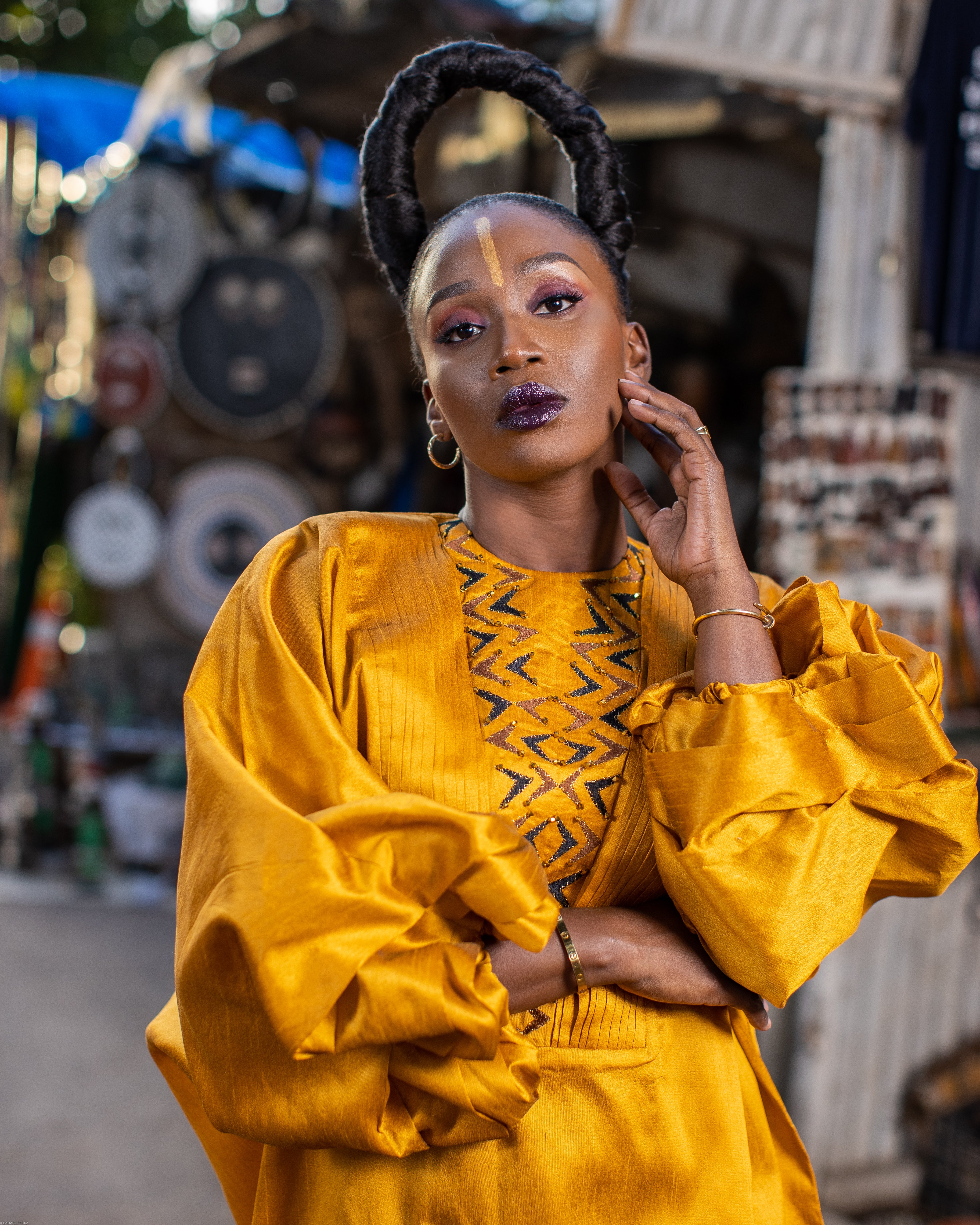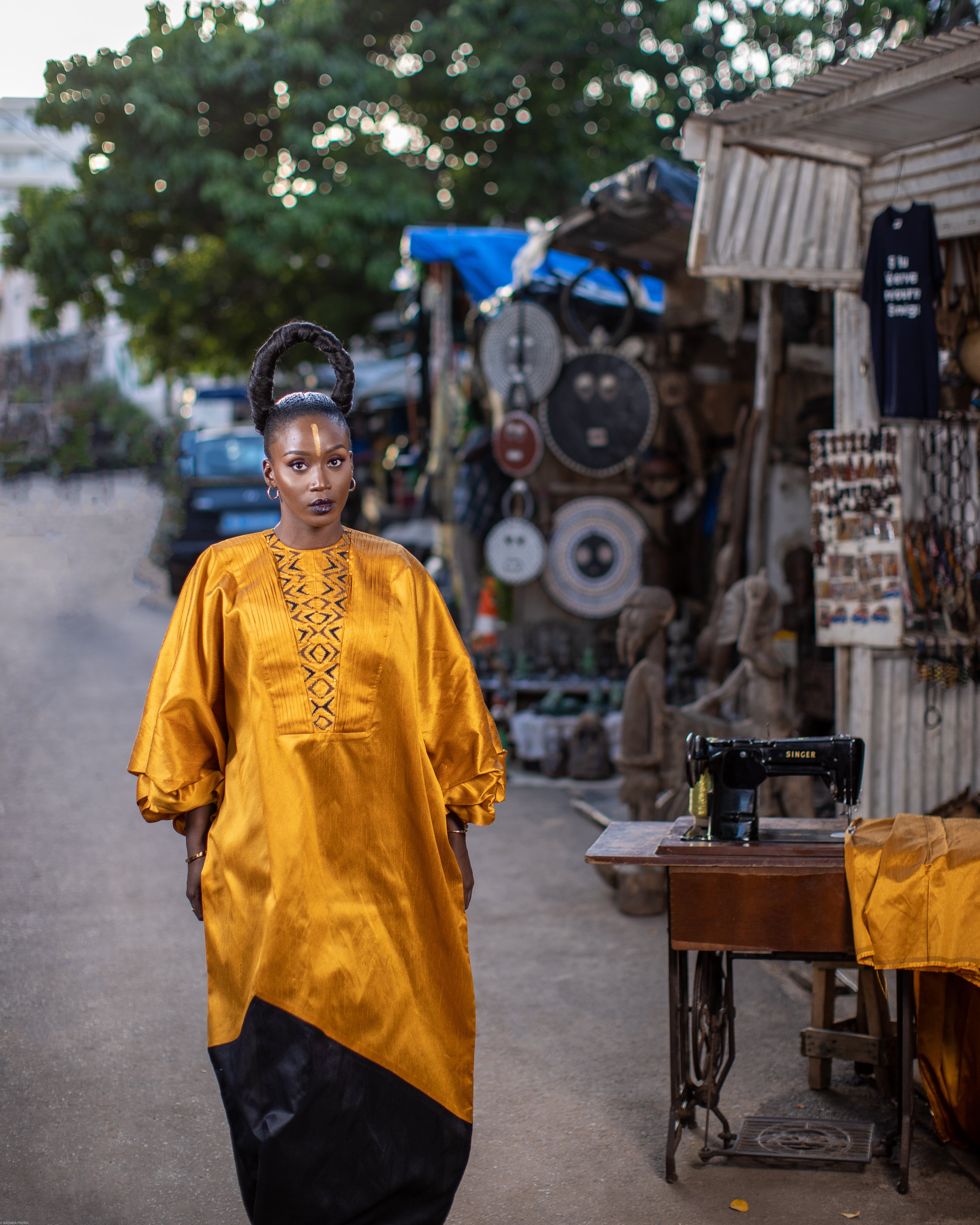 Le Boubou Kassa joue sur le contraste saisissant du jaune or et du noir. Sa tunique courte brodée d'un plastron diamant géométrique et ses manches ballon en font une pièce dynamique et moderne.